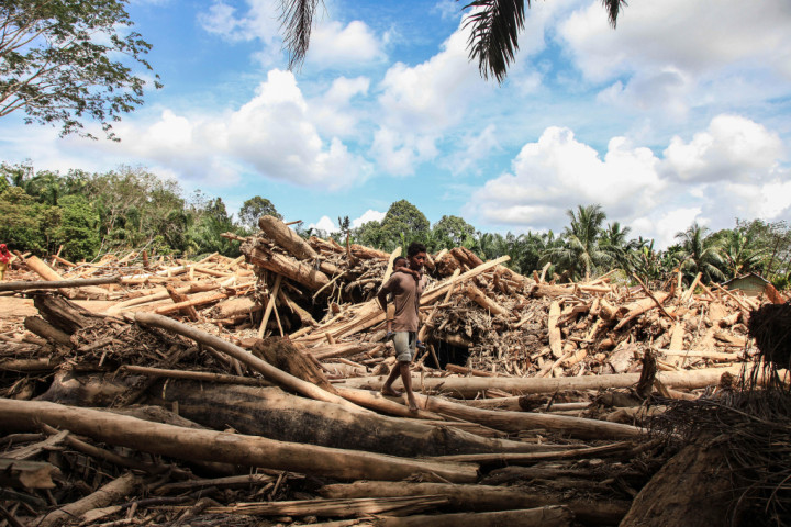 当地时间2025年12月8日,印度尼西亚亚齐省亚齐塔米昂,一名男子走在被山洪冲走的木材中。视觉中国图