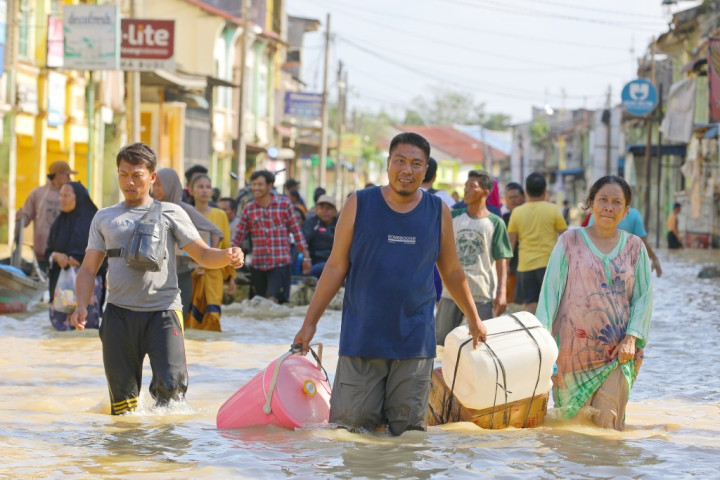 当地时间2025年11月30日,印度尼西亚苏门答腊岛冷吉县丹戎普拉镇,大批民众从被洪水淹没的道路中转移。视觉中国图