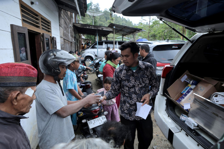 11月27日,在印度尼西亚苏门答腊岛北苏门答腊省,工作人员为村民分发药物。